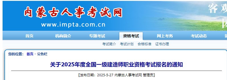 內(nèi)蒙古人事考試網(wǎng)發(fā)布關(guān)于2025年度全國一級建造師職業(yè)資格考試報名的通知,具體信息如下: