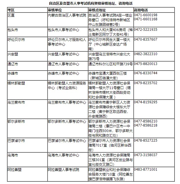 附件:自治區(qū)及各盟市人事考試機構(gòu)資格審核地址、咨詢電話