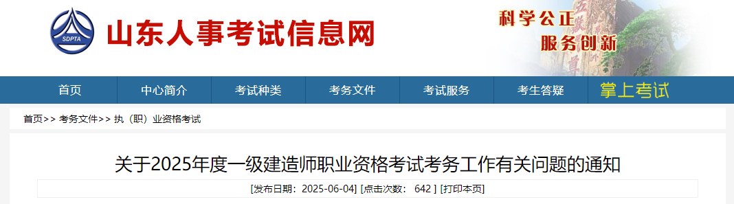 山東人事考試信息網(wǎng)發(fā)布關(guān)于2025年度一級(jí)建造師職業(yè)資格考試考務(wù)工作有關(guān)問(wèn)題的通知,具體信息如下: