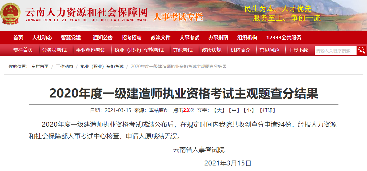 云南人力資源和社會保障網(wǎng)發(fā)布《2020年度一級建造師執(zhí)業(yè)資格考試主觀題查分結(jié)果》,詳情如下:
