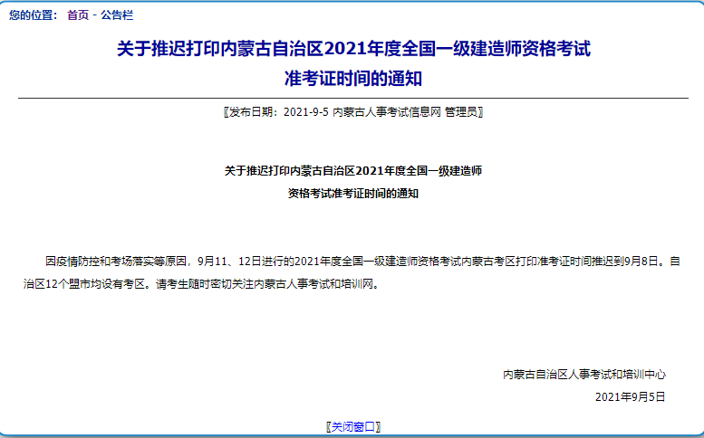 關(guān)于推遲打印內(nèi)蒙古自治區(qū)2021年度全國一級建造師資格考試準(zhǔn)考證時間的通知