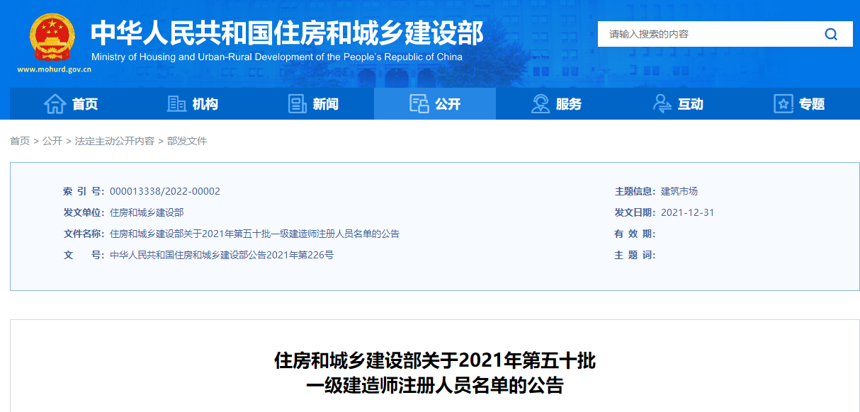 住建部2021年第50批一級建造師注冊人員名單公告(17385名)