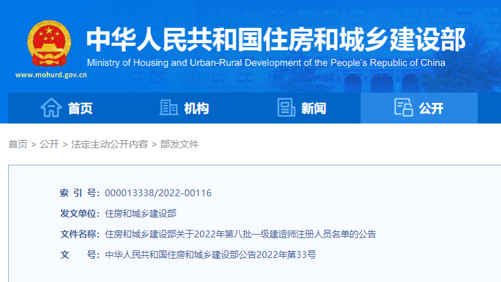 住房和城鄉(xiāng)建設(shè)部關(guān)于2022年第八批一級建造師注冊人員名單的公告
