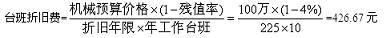 某施工機械預算價格為100萬元,折舊年限為10年,年平均工作225個臺班,殘值率為4%,則該機械臺班折舊費為( )元。
