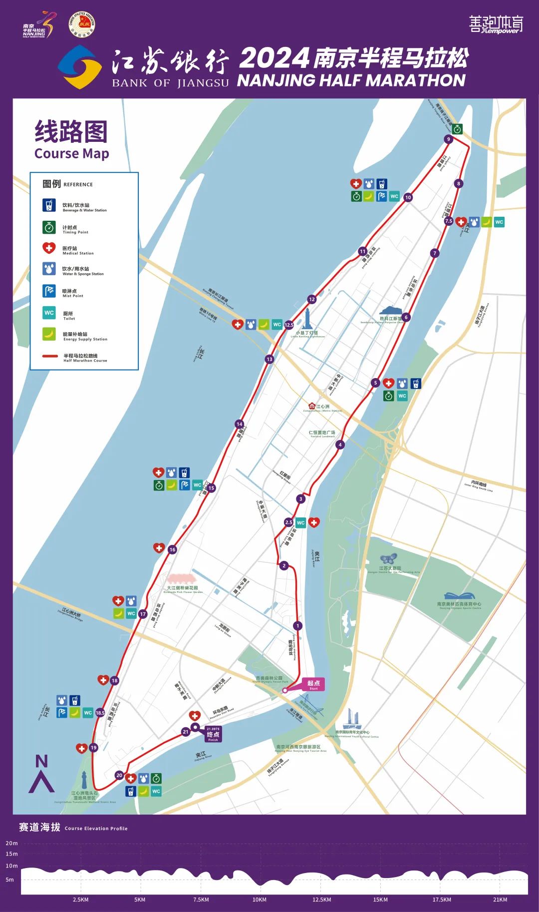 比賽路線由南京青奧森林公園南門出發(fā),環(huán)島奔跑,全長21.0975公里?!澳习腭R”賽道基本規(guī)避了對城市道路交通的影響,能夠進一步提升跑者體驗感。同時為助力選手跑出好成績,組委會對賽事起跑段和沖刺段進行了優(yōu)化設計。選手將在環(huán)島東路上進行前3.3公里的起跑和最后1公里的沖刺。環(huán)島東路路面寬闊,賽道最寬處達14米,更有利于選手創(chuàng)造個人PB。