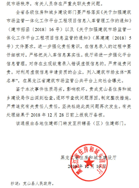 黑龍江省住房城鄉(xiāng)建設(shè)廳關(guān)于對(duì)克山縣住建局在建筑市場(chǎng)公共服務(wù)監(jiān)管平臺(tái)錄入虛假業(yè)績(jī)的通報(bào)