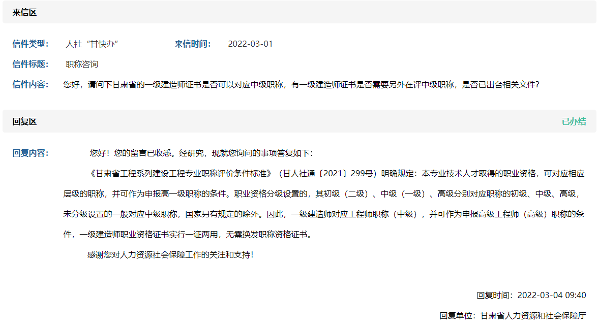 【快問快答】甘肅省一級建造師是否可以對應(yīng)中級職稱?