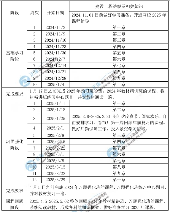 2、已報網(wǎng)校2025年一級建造師輔導尊享無憂班/VIP特訓營的同學,將由系統(tǒng)根據(jù)您的入學信息及學習時間智能生成更合理的學習規(guī)劃,如與本表不一致,請以智能備考方案中的學習計劃為準。