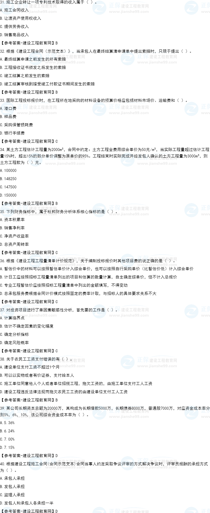 2022年一級(jí)建造師工程經(jīng)濟(jì)補(bǔ)考試題及答案31-40題。建設(shè)工程教育網(wǎng)考后將會(huì)根據(jù)學(xué)員反饋,及時(shí)匯總2022年一級(jí)建造師工程經(jīng)濟(jì)補(bǔ)考試題及答案分享給大家,并且會(huì)及時(shí)做出答案解析,希望能為廣大一建考生朋友帶來幫助。
