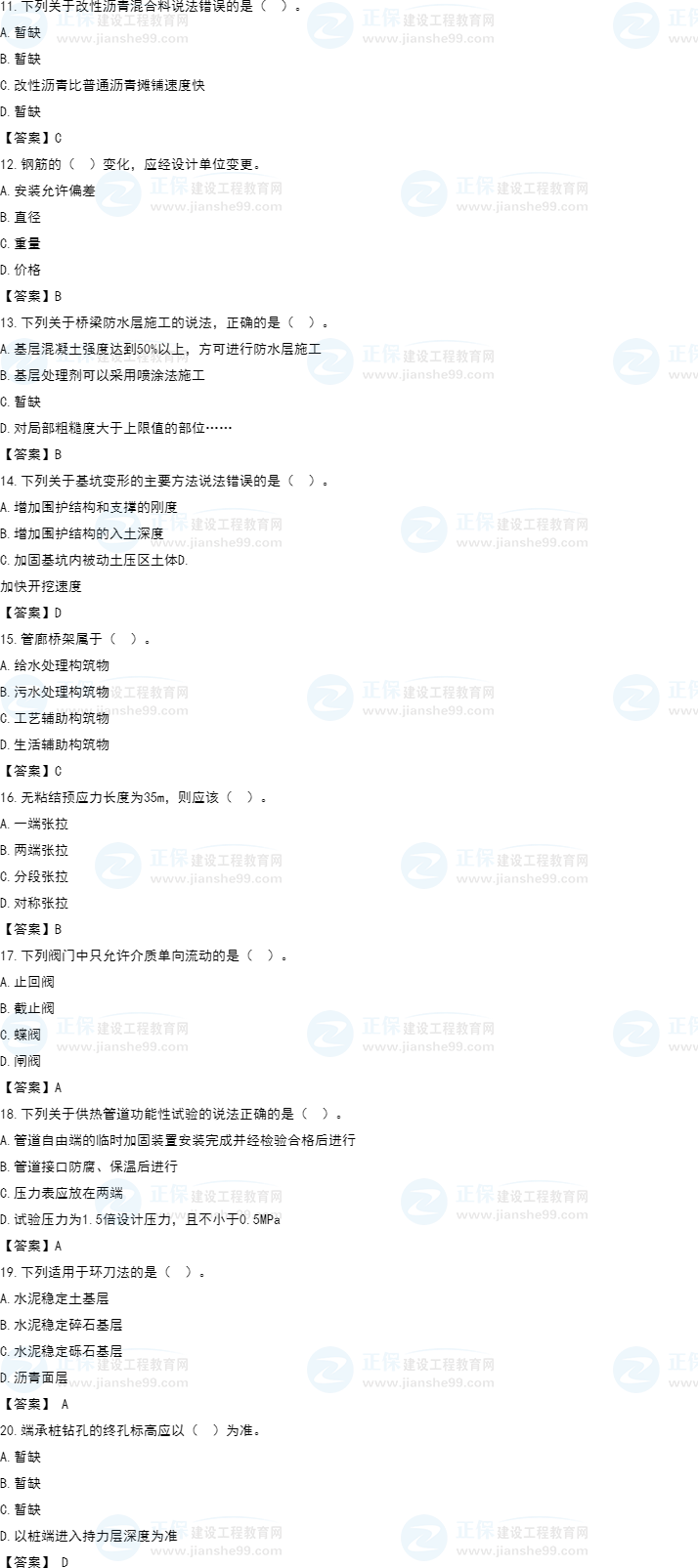 2022年一級(jí)建造師補(bǔ)考市政工程試題及答案解析11-20題。建設(shè)工程教育網(wǎng)考后將會(huì)根據(jù)學(xué)員反饋,及時(shí)匯總2022年一級(jí)建造師補(bǔ)考市政工程試題及答案解析分享給大家,并且會(huì)及時(shí)做出一級(jí)建造師答案解析,希望能為廣大一建考生朋友帶來(lái)幫助。