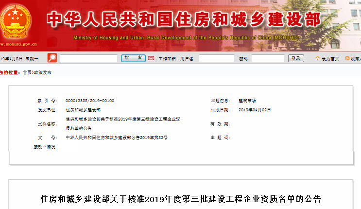 日前,住房和城鄉(xiāng)建設部公布《關于核準2019年度第三批建設工程企業(yè)資質(zhì)名單的公告》: