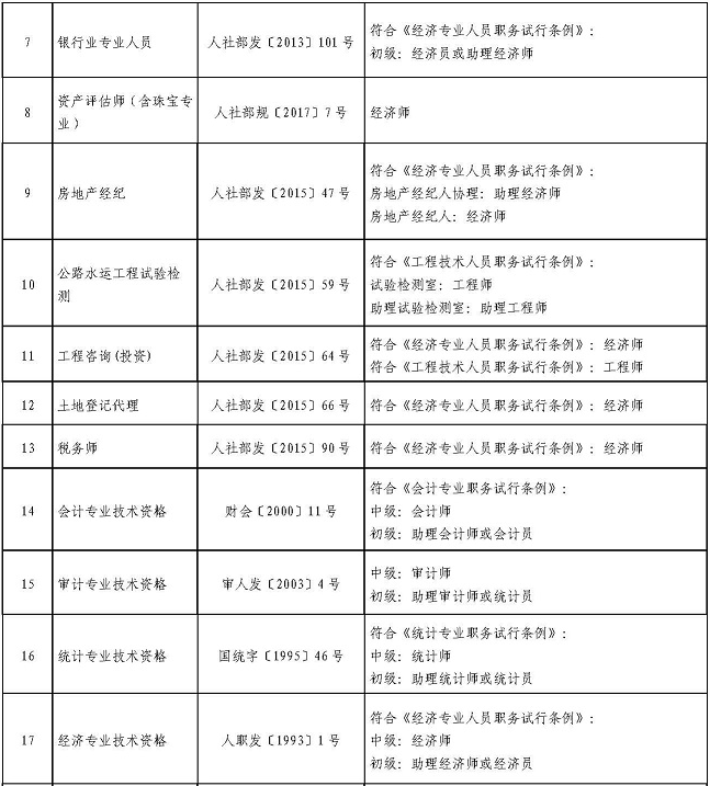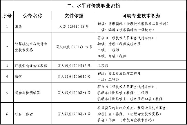 三、取得出版、計(jì)算機(jī)軟考、環(huán)境影響評(píng)價(jià)過(guò)程、通信、機(jī)動(dòng)車(chē)檢測(cè)維修、社會(huì)工作者、銀行業(yè)、資產(chǎn)評(píng)估、房地產(chǎn)經(jīng)紀(jì)、公路水運(yùn)工程試驗(yàn)檢測(cè)、工程咨詢(xún)(投資)等19項(xiàng)水平評(píng)價(jià)類(lèi)職業(yè)資格人員,用人單位可根據(jù)相關(guān)任職條件和崗位空缺情況聘任相應(yīng)的專(zhuān)業(yè)技術(shù)職務(wù)。