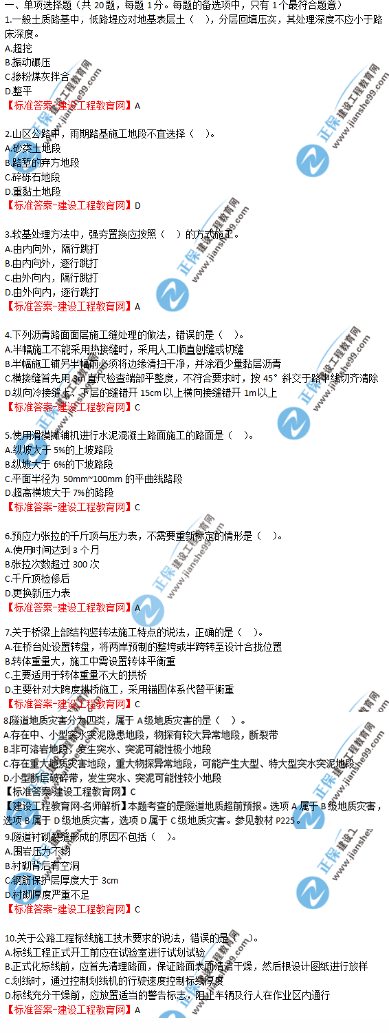 2018年一級建造師《公路實務》試題答案及解析(1-10),由考生回憶題干,建設工程教育網一級建造師考試教研組團提供參考答案,供廣大考生進行參考!點擊查看2019年一級建造師招生方案>>