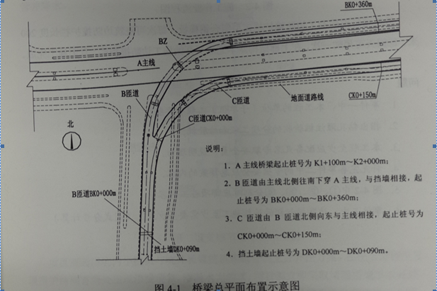 某市政工程公司承建城市主干道改造工程標(biāo)段,合同金額為9800萬元,工程主要內(nèi)容為:主線高架橋梁、匝道橋梁、擋土墻及引道,如圖4-1所示。橋梁基礎(chǔ)采用鉆孔灌注樁:上部結(jié)構(gòu)為預(yù)應(yīng)力混凝土連續(xù)箱梁,采用滿堂支架法現(xiàn)澆施工。邊防撞護(hù)欄為鋼筋混凝土結(jié)構(gòu)。