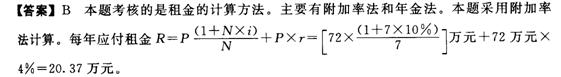本題考核的是租金的計(jì)算。采用附加率法計(jì)算是每年的租金=50×[(1+5×8%)/5]萬元十50萬元×4%=16.0萬元。
