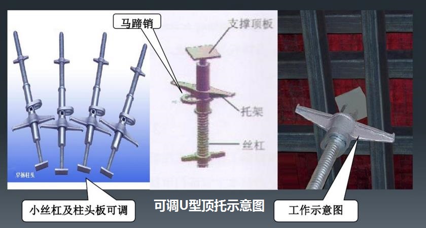 能夠“快拆/早拆”,完全依托于一個叫“可調(diào)U型頂托”的工具。它在各地叫法不盡相同,也可稱為U托、油托或絲杠。在支設(shè)混凝土板模板時(shí)用到可調(diào)節(jié)高度的頂托,可以與腳手架或碗扣腳手架配合使用,起到上頂混凝土板底模膠合板,下托混凝土板底模主次龍骨的作用。