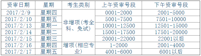 一、考生務(wù)必根據(jù)報(bào)名表上的“資審序號(hào)”(資審序號(hào)只有進(jìn)入個(gè)人網(wǎng)上報(bào)名系統(tǒng)點(diǎn)擊“打印報(bào)名表”按鈕后方可出現(xiàn),下表中“資審號(hào)段”為報(bào)名表上“資審序號(hào)”)按下表規(guī)定時(shí)間參加資格審核,非當(dāng)日資審號(hào)段的考生均不受理,請(qǐng)廣大考生注意并嚴(yán)格遵守。