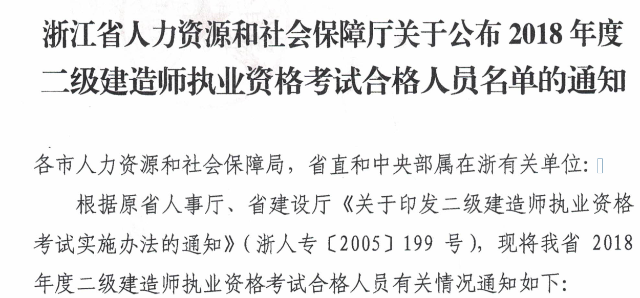浙江人力資源和社會(huì)保障廳關(guān)于公布2018年度二級(jí)建造師執(zhí)業(yè)資格考試合格人員名單的通知