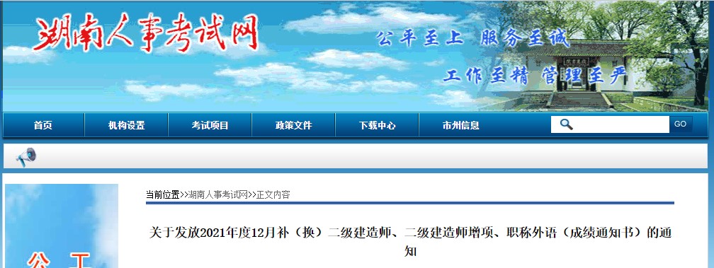 2021年度12月補(bǔ)(換)二級建造師、二級建造師增項(xiàng)、職稱外語(成績通知書)現(xiàn)已開始發(fā)放,請遞交補(bǔ)辦申請時選擇現(xiàn)場領(lǐng)證的考生攜本人身份證原件到湘府中路湖南人才市場三樓313辦公室領(lǐng)取,聯(lián)系電話:0731-84688383;請選擇郵寄證書(成績通知書)的考生注意查收EMS郵政特快專遞。(2016年度及之后的二級建造師、2011年度之后的職稱外語(成績通知書)由考試報(bào)名所屬市州通知)