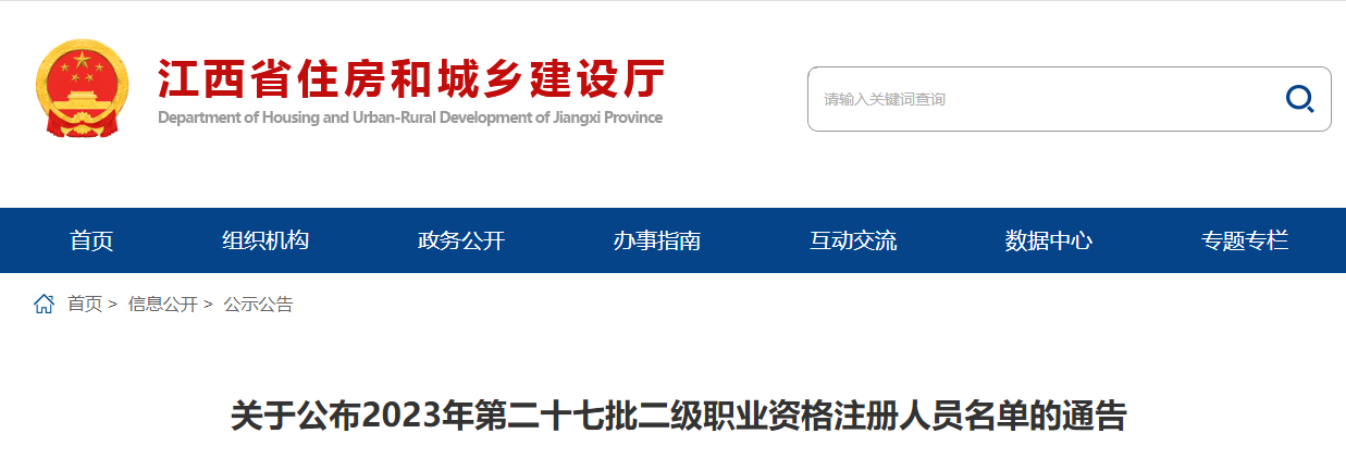 江西住建廳公布2023年第二十七批二級(jí)職業(yè)資格注冊(cè)人員名單的通告
