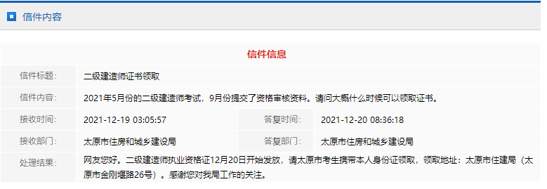 太原市公布二級(jí)建造師證書領(lǐng)取時(shí)間及其地點(diǎn)