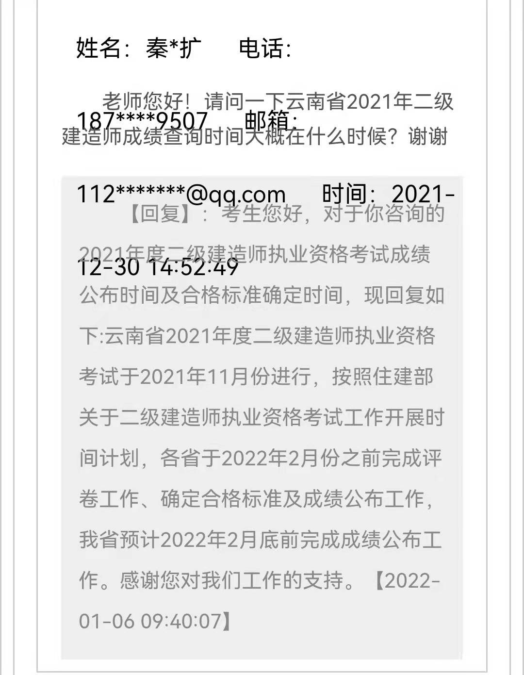 云南省2021年二級建造師考試成績暫未發(fā)布,有同學就相關問題咨詢了相關單位,相關單位給出回復,21年二級建造師評卷工作預計2月份完成,希望各位考生耐心等待!預祝大家都能取得好成績!