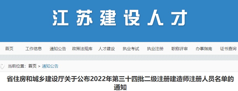 江蘇關(guān)于公布2022年第三十四批二級注冊建造師注冊人員名單的通知