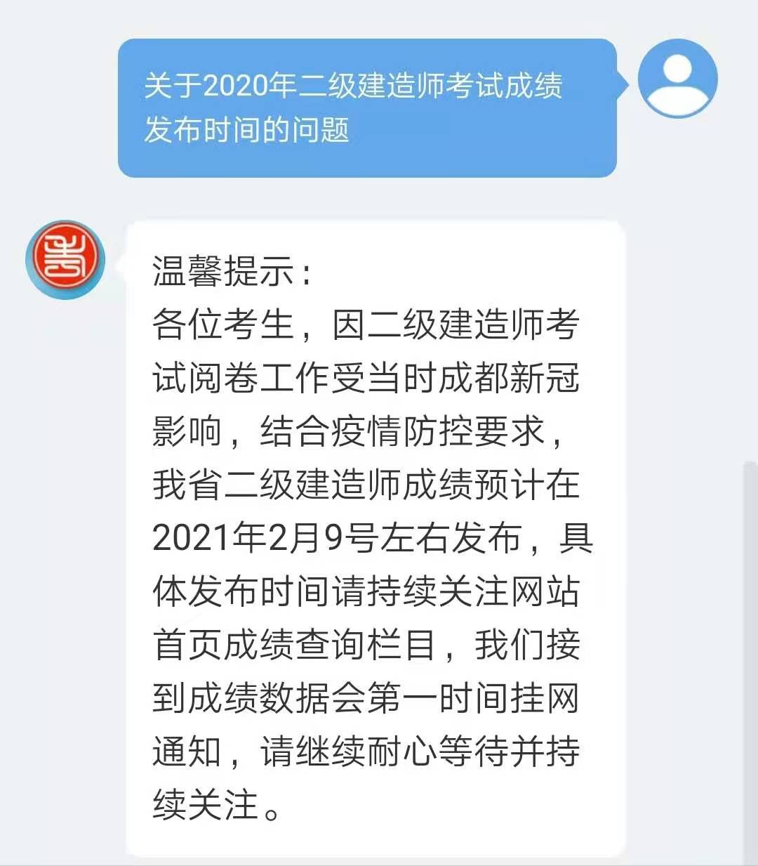 2020年四川二級建造師考試成績預計在2月9日左右發(fā)布!請大家密切關(guān)注網(wǎng)校二級建造師考試欄目,我們會及時通知大家!