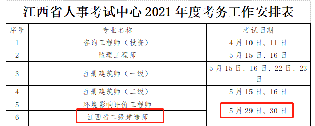 江西人事考試網(wǎng)發(fā)布《江西省人事考試中心2021年度考務(wù)工作安排表》,其中明確2021年江西二級建造師考試時間為5月29日、30日。