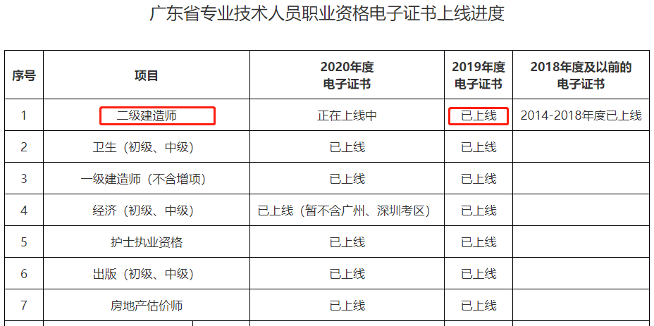 廣東省專業(yè)技術(shù)人員職業(yè)資格電子證書(shū)上線進(jìn)度表格顯示,2019年二級(jí)建造師電子證書(shū)已上線,2020年二級(jí)建造師電子證書(shū)正在上線中。