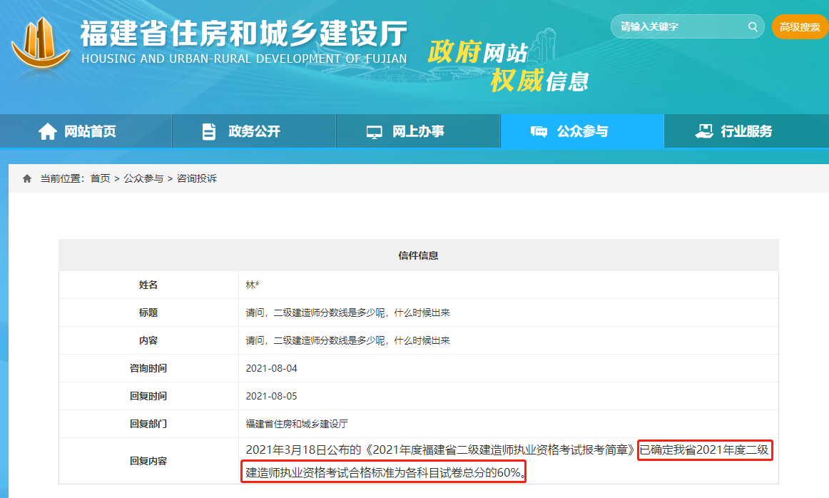 福建省住房和城鄉(xiāng)建設(shè)廳網(wǎng)站顯示,2021年3月18日公布的《2021年度福建省二級建造師執(zhí)業(yè)資格考試報考簡章》已確定福建省2021年度二級建造師執(zhí)業(yè)資格考試合格標(biāo)準(zhǔn)為各科目試卷總分的60%。