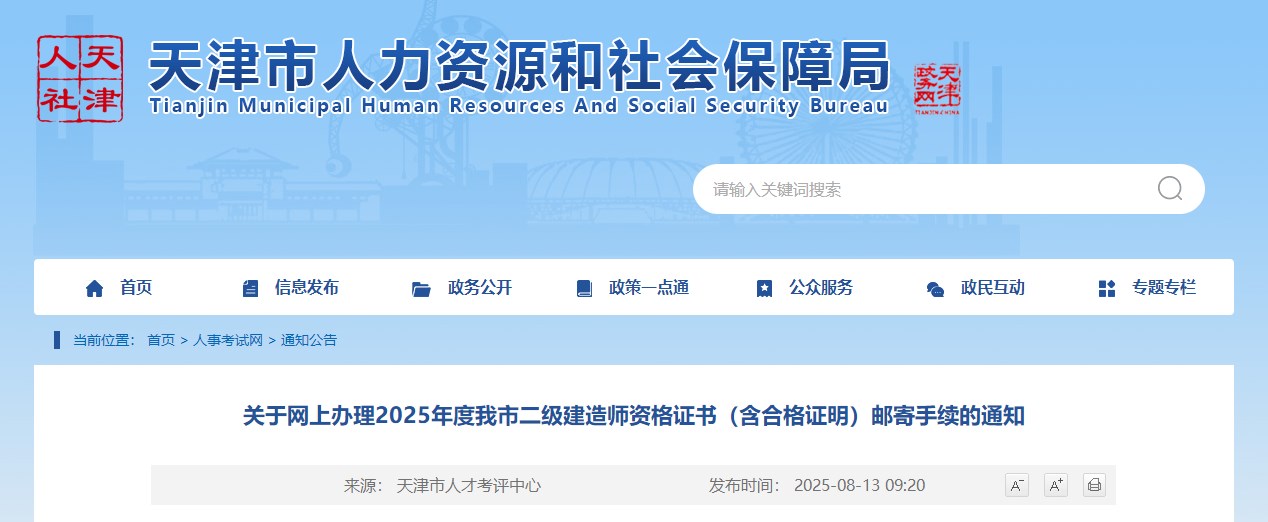 天津市人力資源和社會保障局發(fā)布關(guān)于網(wǎng)上辦理2025年度我市二級建造師資格證書(含合格證明)郵寄手續(xù)的通知,具體信息如下: