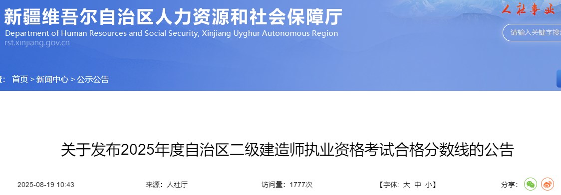 新疆維吾爾自治區(qū)人力資源和社會(huì)保障廳發(fā)布關(guān)于發(fā)布2025年度自治區(qū)二級(jí)建造師執(zhí)業(yè)資格考試合格分?jǐn)?shù)線的公告,具體信息如下: