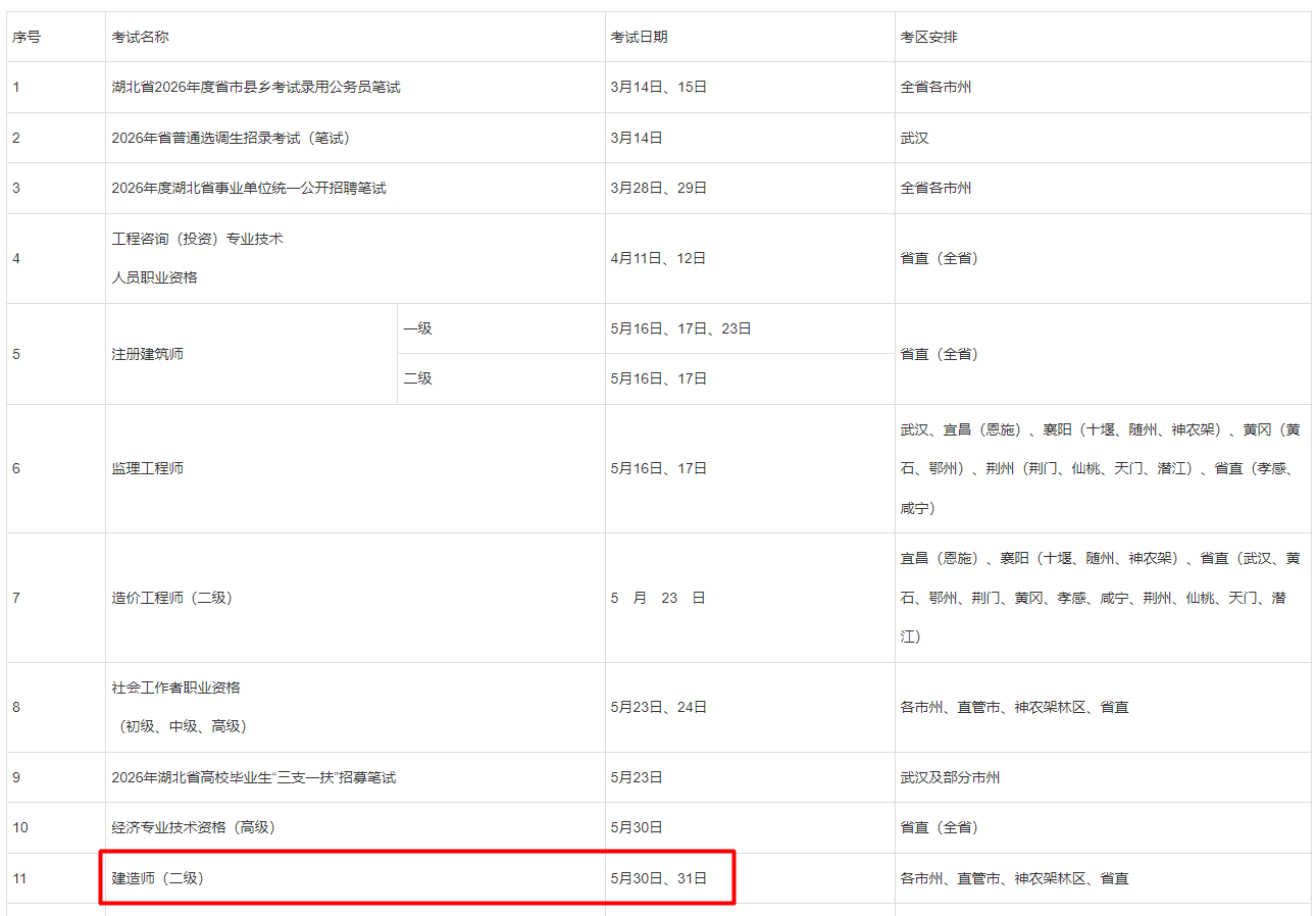 湖北省2026年二級建造師考試時間:5月30日、31日