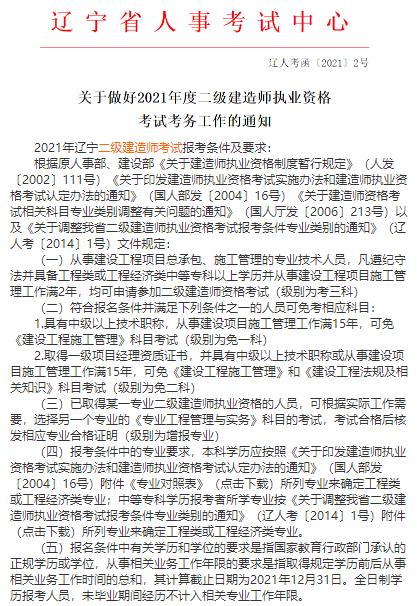 遼寧2022年二級建造師考試報考條件還沒有公布,不過一般不會有大的變動,大家可以參考2021年的報考條件。