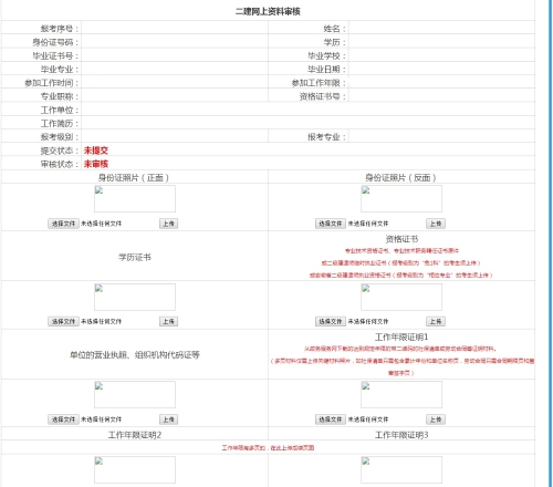 5、根據(jù)系統(tǒng)提示上傳對應的資料,包括居民身份證、學歷證書(2002年大專及以上學歷請上傳學信網(wǎng)查詢的帶二維碼的學歷驗證報告)、專業(yè)技術資格證書、專業(yè)技術職務聘任證書、二級建造師臨時執(zhí)業(yè)證書(報考級別為“免1科”的考生須上傳)、安徽省二級建造師執(zhí)業(yè)資格證書(報考級別為“相應專業(yè)”的考生須上傳)、單位的營業(yè)執(zhí)照(或組織機構代碼證等)、工作年限證明(從政務服務網(wǎng)下載的達到規(guī)定年限的帶二維碼的社保清單或勞動合同)(未選擇“告知承諾制”的必須上傳帶二維碼的社保清單,社保清單不足1年的還需上傳符合報考年限的勞動合同)。