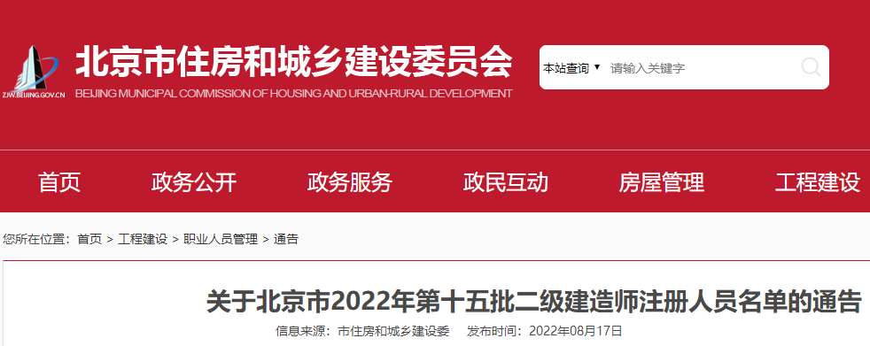 關(guān)于北京市2022年第十五批二級建造師注冊人員名單的通告