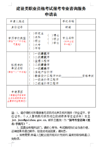 答復(fù):實名制只是認證對學(xué)歷進行認證,并不對認證專業(yè)是否符合報考條件進行審核。通過實名制認證,登錄報名系統(tǒng)后,系統(tǒng)會自動對認證學(xué)歷專業(yè)進行比對是否符合要求。若專業(yè)比對不符合報考條件且認為認證專業(yè)與可報考專業(yè)相近,可填寫《建設(shè)類職業(yè)資格考試報考專業(yè)咨詢服務(wù)申請表》(詳見下表),發(fā)送至郵箱:jst.jnzx@guizhou.gov.cn進行咨詢,郵件主題統(tǒng)一為“報考專業(yè)咨詢(姓名+手機號)”。