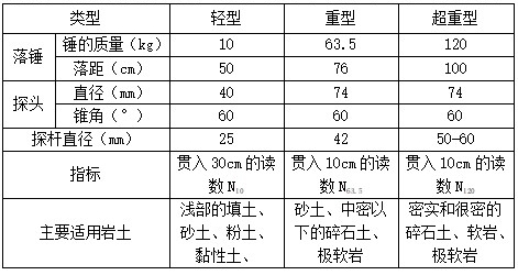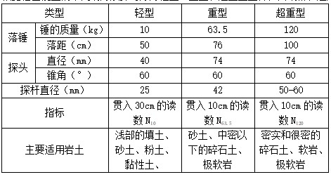 根據(jù)錘擊能量的不同動力觸探可分為輕型、重型和超重型三種,其規(guī)格和適用土類如下: