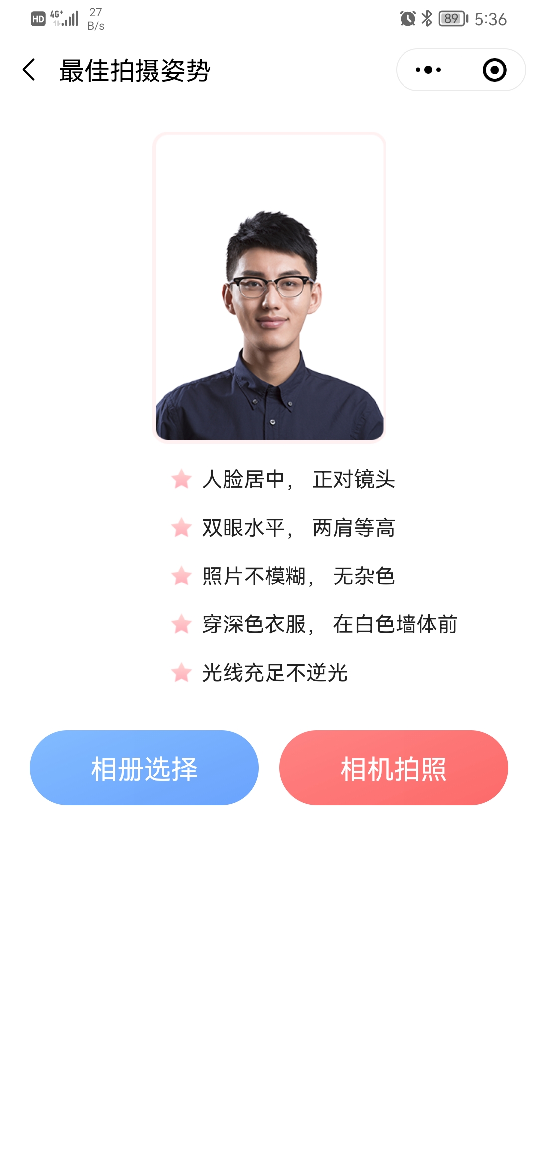 7.可從相冊(cè)中選擇或用手機(jī)的相機(jī)拍攝一張照片,我們將自動(dòng)為您生成符合報(bào)名要求的報(bào)名照片。