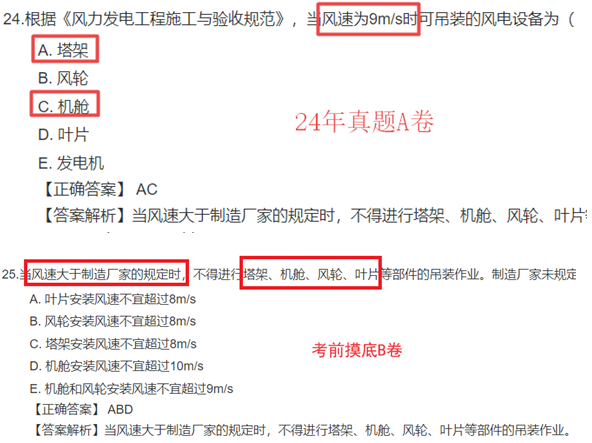 考點詳解:當風速大于制造廠家的規(guī)定時,不得進行塔架、機艙、風輪、葉片等部件的吊裝作業(yè)。制造廠家未規(guī)定安裝風速的,葉片和風輪安裝風速不宜超過8m/s,塔架、機艙安裝風速不宜超過10m/s。
