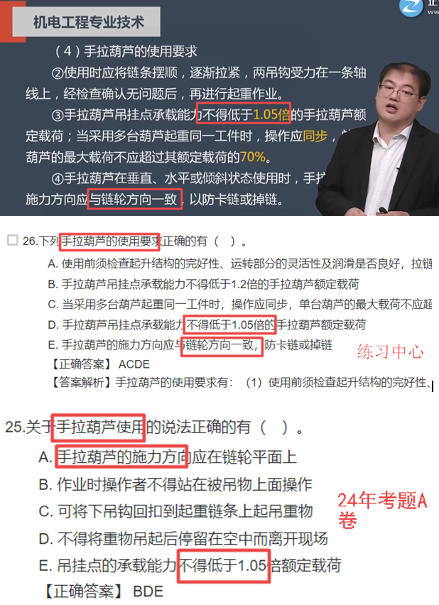 考點詳解:手拉葫蘆的使用要求:①使用前須檢查起升結構的完好性、運轉部分的靈活性及潤滑是否良好,拉鏈應靈活自如,不應有跑鏈、掉鏈和卡滯現(xiàn)象。②使用時應將鏈條擺順,逐漸拉緊,兩吊鉤受力在一條軸線上,經(jīng)檢查確認無問題后,再進行起重作業(yè)。③手拉葫蘆吊掛點承載能力不得低于1.05倍的手拉葫蘆額定載荷;當采用多臺葫蘆起重同一工件時,操作應同步,單臺葫蘆的最大載荷不應超過其額定載荷的70%。④手拉葫蘆在垂直、水平或傾斜狀態(tài)使用時,手拉葫蘆的施力方向應與鏈輪方向一致,以防卡鏈或掉鏈。