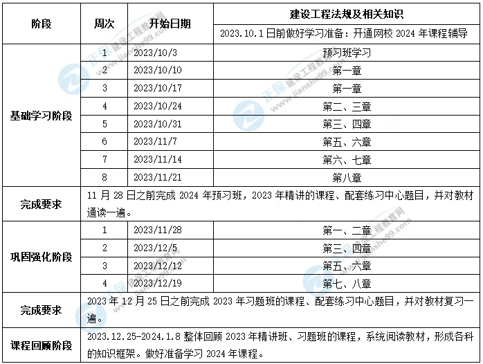 3、以上時間進度,包含了同學們預習教材,正式聽課,做練習中心的時間。對剛接觸建造師考試的同學來說,剛開始進度可能會比較慢,沒關系,這很正常,在第一階段給了較為充裕的時間,等第一遍復習完成后,你們的速度就會逐步的提上去趕上進度了,同時建議同學們要根據(jù)自己的工作,學習情況合理安排好時間和進度,這樣學習效果會更好。
