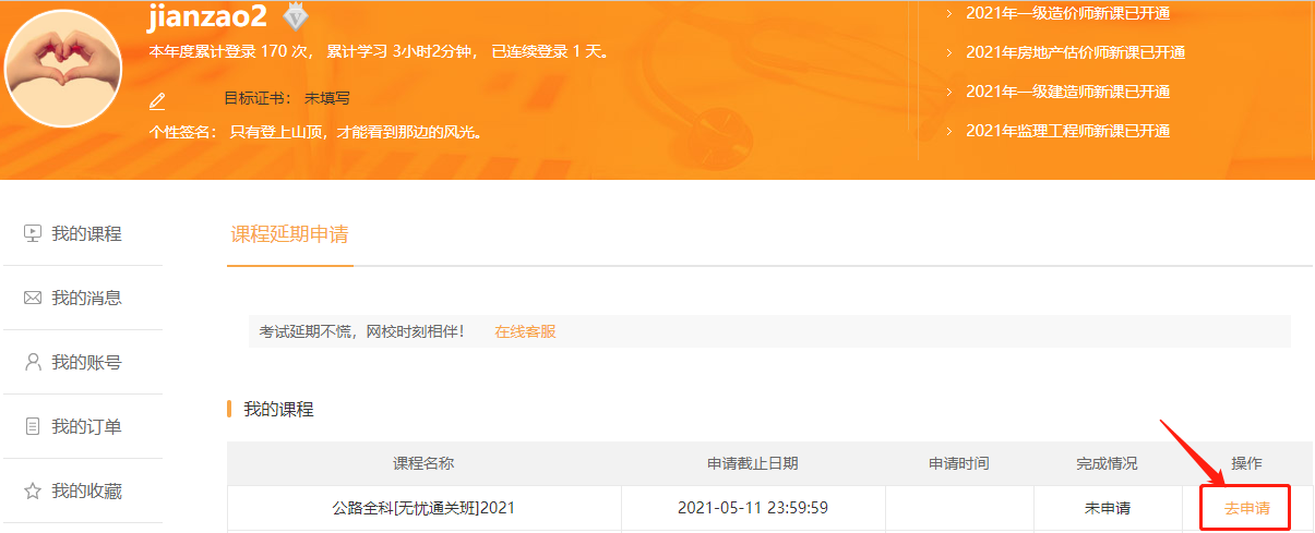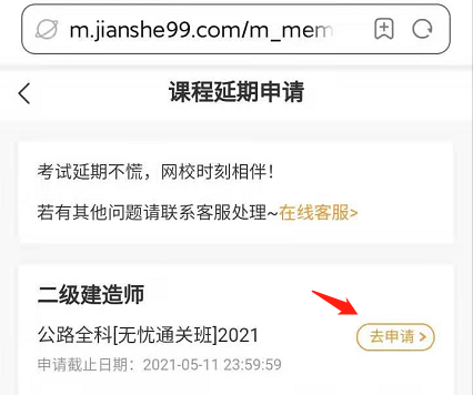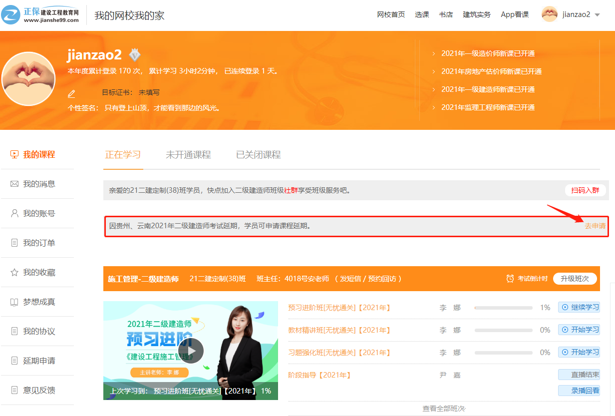之前已經(jīng)報名網(wǎng)校2021年二級建造師考試課程的貴州、云南地區(qū)二建學員,可以申請課程延期了,入口在“我的網(wǎng)校我的家”,請大家及時申請,不要錯過。