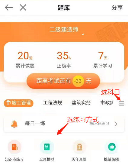2、進(jìn)入題庫,選擇考試科目和練習(xí)方式。