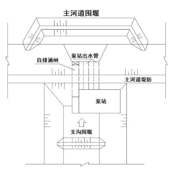 某小型排澇樞紐工程,由排澇泵站、自排涵閘和支溝口主河道堤防等建筑物組成。泵站和自排涵閘的設(shè)計(jì)排澇流量均為9.0m3/s,主河道堤防級(jí)別為3級(jí)。排澇樞紐平面布置示意圖見(jiàn)下: