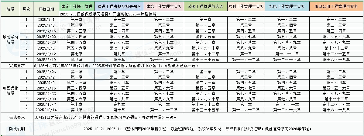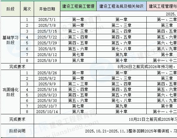 1、整體進(jìn)度說明:本計劃表從2025年7月1日開始執(zhí)行,計劃于2025年11月3日結(jié)束,共計18周;其中:基礎(chǔ)學(xué)習(xí)階段安排8周,鞏固強(qiáng)化階段安排8周,課程回顧階段安排2周。學(xué)員可根據(jù)本表的提示,結(jié)合自己的工作,學(xué)習(xí)情況進(jìn)行細(xì)化,并按網(wǎng)校要求完成聽課、做題的學(xué)習(xí)任務(wù),基本可滿足考試需要。