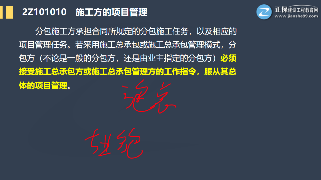分包施工方承擔(dān)合同所規(guī)定的分包施工任務(wù),以及相應(yīng)的項(xiàng)目管理任務(wù)。若采用施工總承包或施工總承包管理模式,分包方(不論是一般的分包方,還是由業(yè)主指定的分包方)必須接受施工總承包方或施工總承包管理方的工作指令,服從其總體的項(xiàng)目管理。