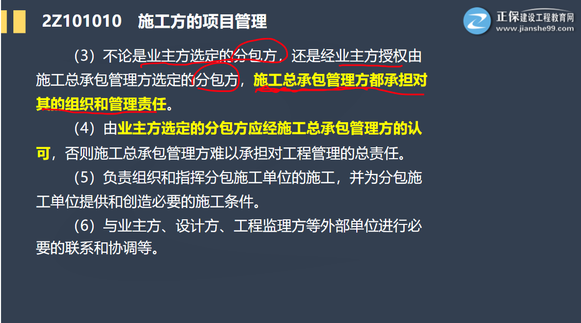 (5)負責組織和指揮分包施工單位的施工,并為分包施工單位提供和創(chuàng)造必要的施工條件。