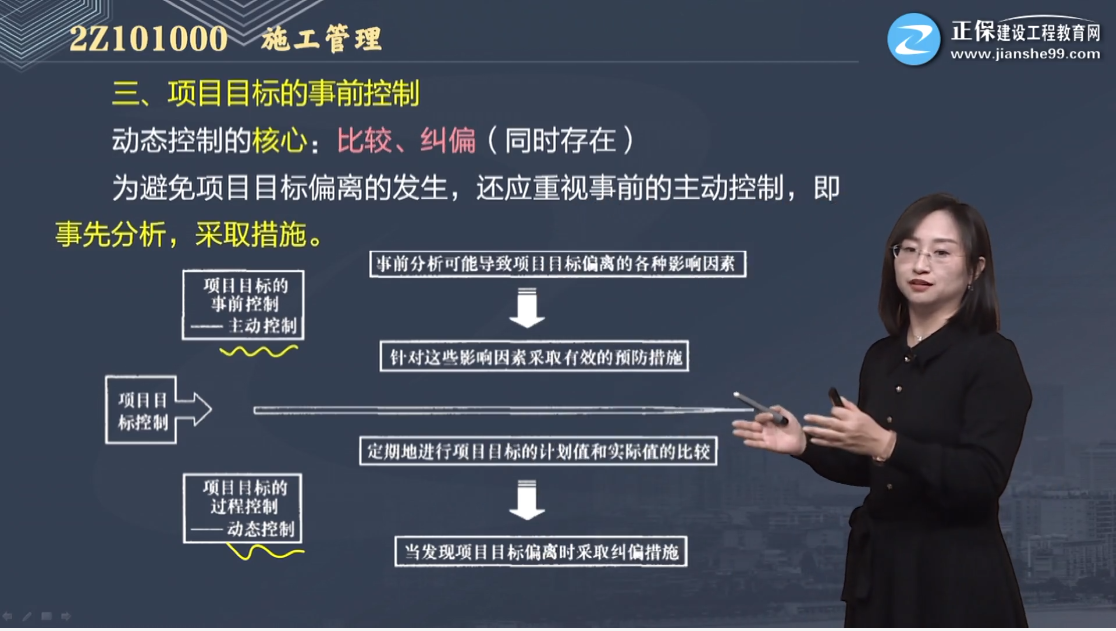 【解析】本題考察的是項目目標(biāo)的事前控制。項目目標(biāo)動態(tài)控制的核心是,在項目實(shí)施的過程中定期地進(jìn)行項目目標(biāo)的計劃值和實(shí)際值的比較,當(dāng)發(fā)現(xiàn)項目目標(biāo)偏離時采取糾錯措施。